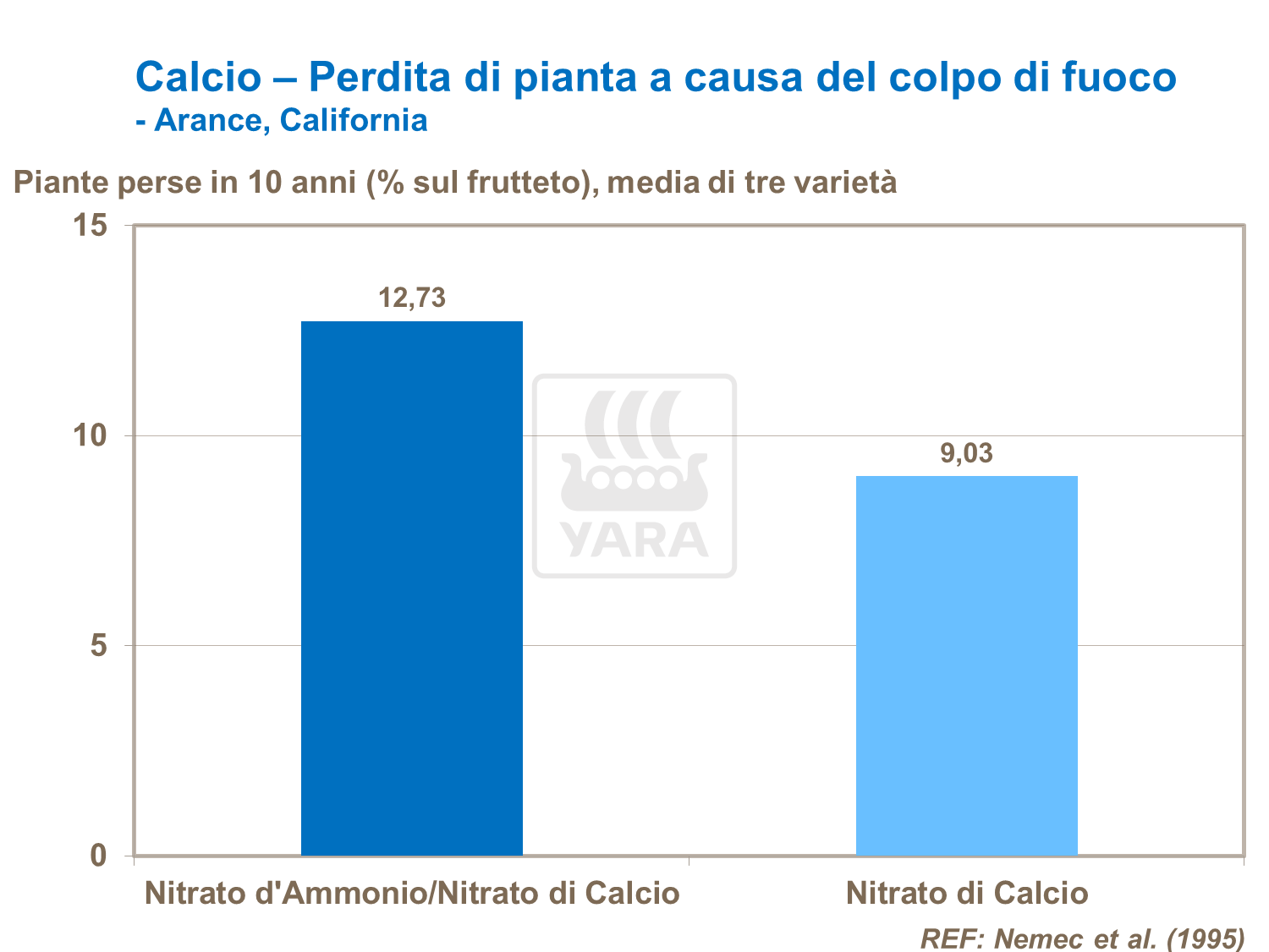 Le ricerche effettuate da Yara su tre varietà di agrumi confermano che le perdite di alberi dovute ad avvizzimento sono significativamente più basse laddove il nitrato di calcio è una componente importante del programma di fertilizzazione. La varietà che ha risposto meglio è l'Hamlin, nella quale il numero di alberi morti si è dimezzato.