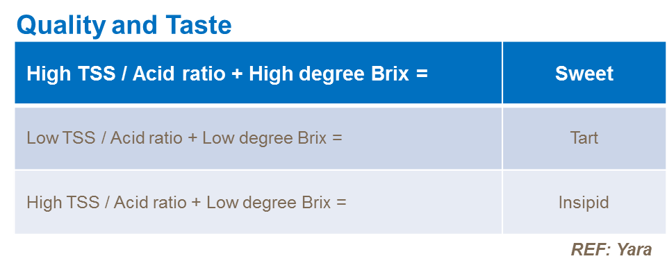 Aroma e sapore sono legati al livello di solidi solubili totali (TSS, Total Soluble Solids), al livello di acidità e alla quantità di sapori aromatici o amari presenti nel frutto. Solitamente il contenuto di solidi solubili totali viene misurato a partire dalla determinazione del Brix del frutto.