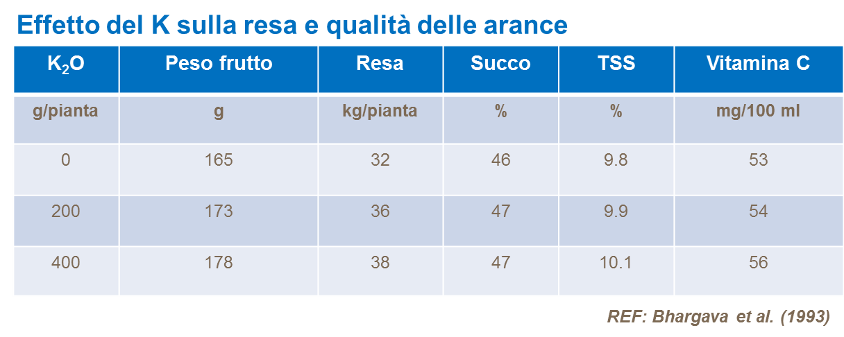 In base agli studi effettuati, il potassio ha un effetto positivo sul peso dei frutti migliorandone l'ingrossamento.