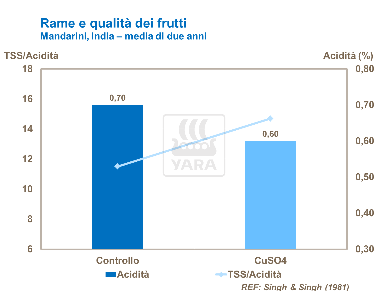 Le prove in India suggeriscono che il rame riduce l'acidità e aumenta il rapporto TSS/acidi nei mandarini.