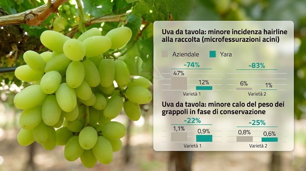 - – 25% cracking: incidenza ridotta dal 54% al 40%, grazie a migliore elasticità dei tessuti e minor stress idrico.