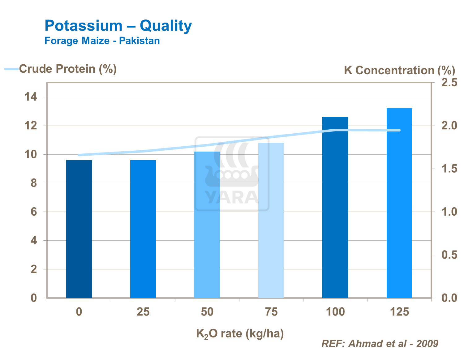 La nutrizione di potassio aumenta il contenuto di proteine grezze nel mais da foraggio. È dimostrato che il boro aumenta il contenuto di amido nel mais da foraggio, incrementandone l'energia.