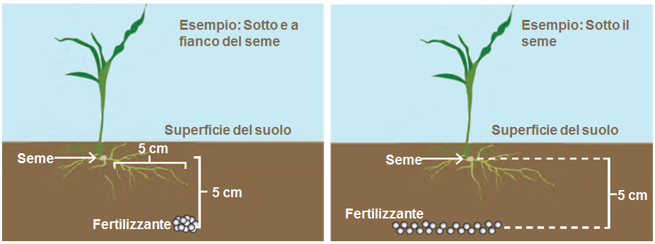 Il posizionamento varia in base all'esperienza locale. Nella maggior parte dei casi, i fertilizzanti starter sono posti sotto e a lato del seme (vedi figura seguente). Quando si utilizzano basse quantità di fertilizzante, la distanza dal seme in Argentina è comunemente pari a 3 cm x 3 cm. Negli Stati Uniti, in Sud Africa e su terreni argillosi in Europa vi sono comunemente distanze superiori, di 5 cm x 5 cm, tra il seme e il fertilizzante.