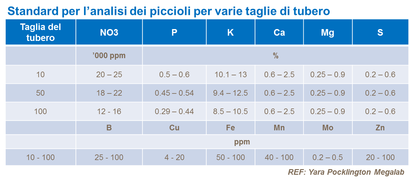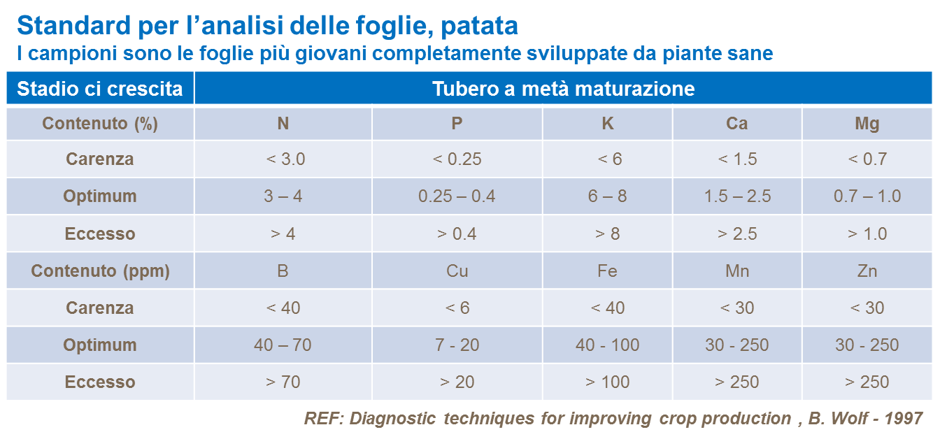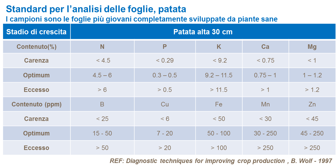 L'analisi del tessuto (picciolo o foglia intera) prelevato durante il ciclo colturale fornisce indicazioni molto più precise sullo stato delle sostanze nutritive e sulla probabilità di alterazioni o carenze, in particolare di micronutrienti. Si vedano le tabelle seguenti.