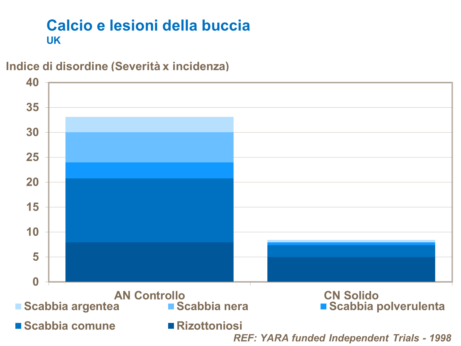 Il calcio rafforza la buccia e assicura una maggiore resistenza a numerose malattie, quali rizottoniosi, scabbia argentea, scabbia polverulenta e comune. Queste sperimentazioni indipendenti condotte nel Regno Unito dimostrano una riduzione delle lesioni della buccia causate da varie alterazioni a seguito del trattamento con nitrato di calcio.