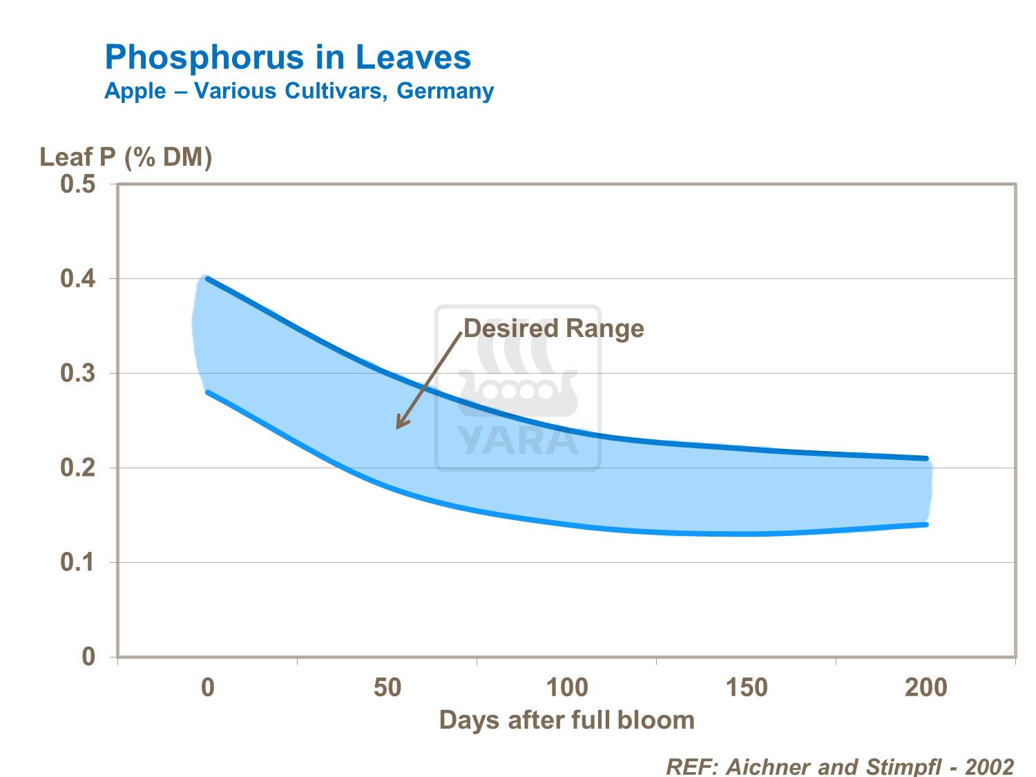 Il Fosforo ha un effetto diretto sulla resa. Con l'avanzare della stagione, la concentrazione di Fosforo nelle foglie diminuisce, a causa del trasferimento ai frutti. Con l'aumentare del peso dei frutti aumenta anche il contenuto di Fosforo. È quindi importante fare in modo che la disponibilità sia sufficiente nel corso di tutta la stagione, affinché la crescita non sia ostacolata e il Fosforo si accumuli stabilmente nei frutti.