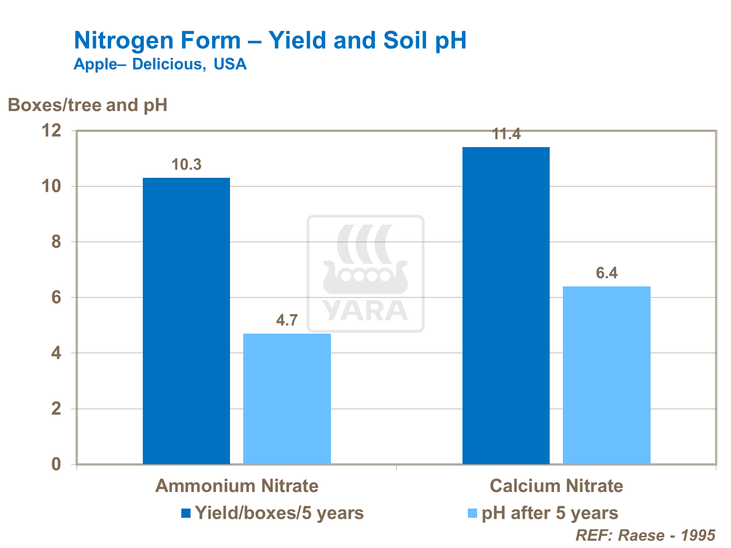 L'Azoto ha un ruolo importante ai fini della resa. Sotto forma di nitrato di Calcio è immediatamente disponibile e può incrementare le rese. Rispetto al nitrato d'ammonio, il nitrato di Calcio è efficace anche nel preservare il pH del suolo, a tutto vantaggio della crescita dell'albero e della disponibilità di altri nutrienti.