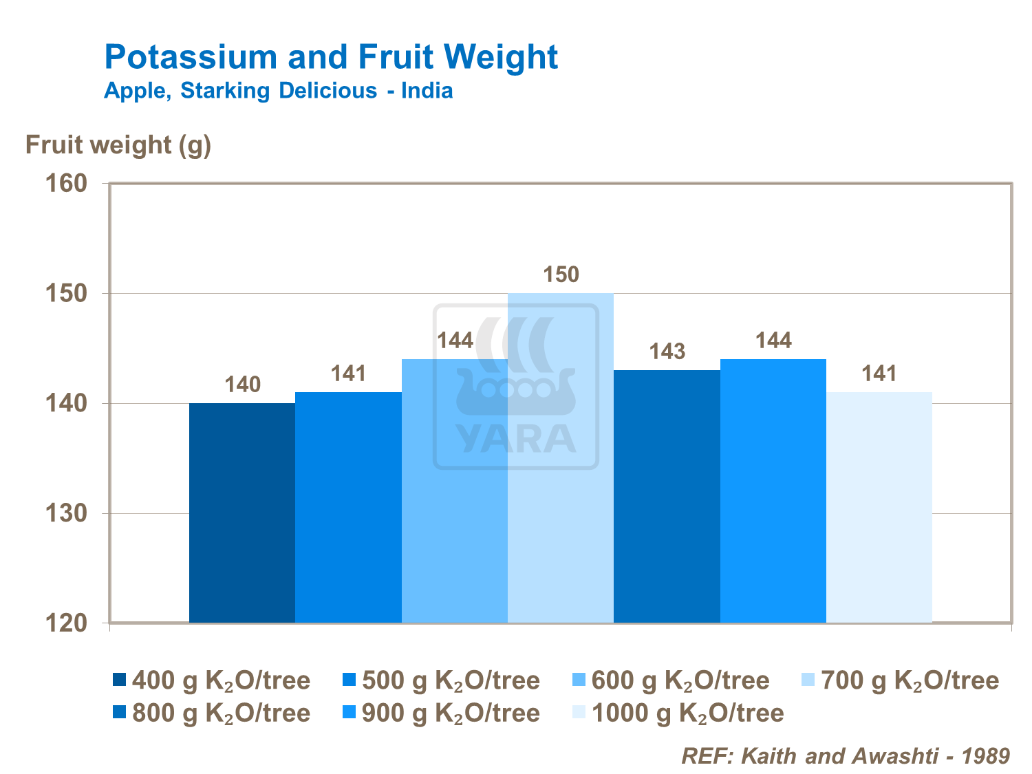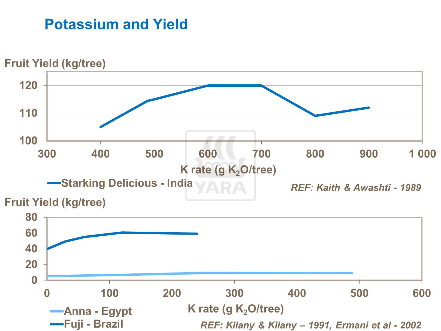 Laddove le disponibilità non sono adeguate, sono stati ottenuti risultati in termini di rese con dosi fino a 600-700 g/K/albero nei frutteti a bassa densità. Parte di tale incremento è collegato a un aumento del peso dei frutti. Tuttavia, le somministrazioni devono essere regolate in base ai livelli di Potassio nel suolo: dove sono alti, le dosi elevate di fertilizzanti K possono ridurre la resa, principalmente a causa dell'assorbimento ridotto di altri cationi (Mg e Ca).