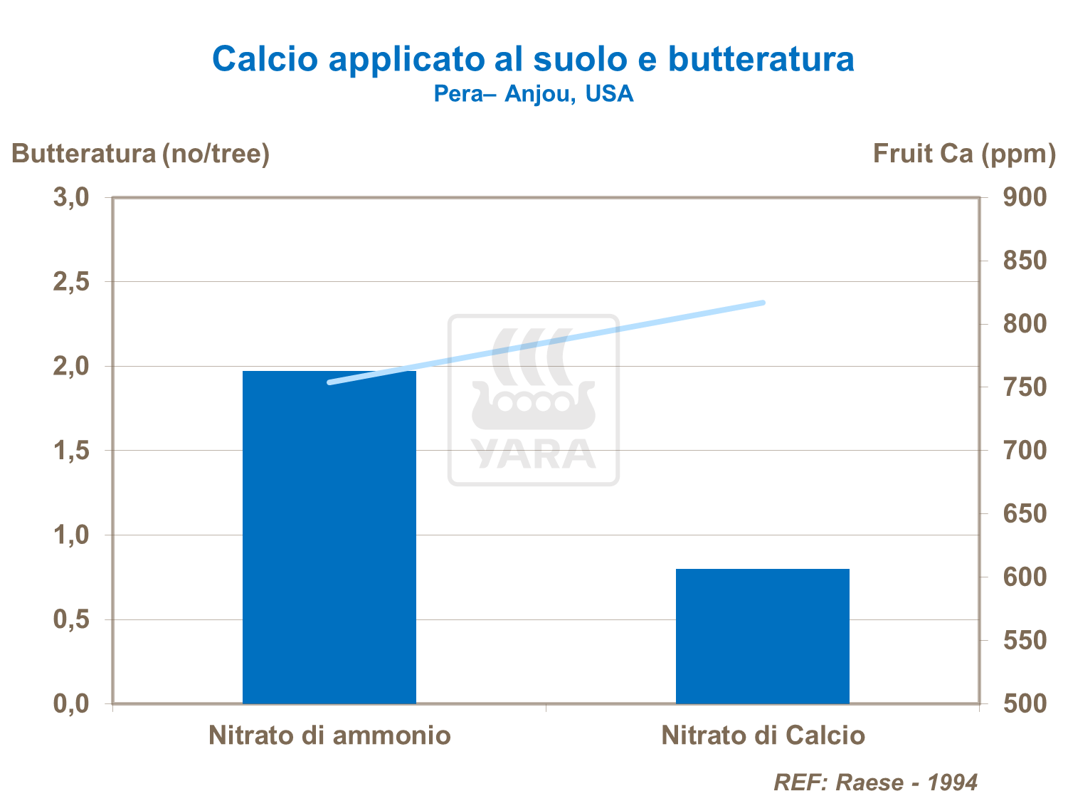 La somministrazione del Calcio sia per via fogliare che al suolo è utile per diminuire l'incidenza della butteratura e dell'inverdimento. Il rapporto N:Ca deve essere mantenuto a 6 o a un valore inferiore al fine di ridurre l'inverdimento nelle pere.