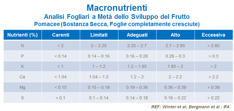Nonostante le tabelle riportino valori considerati efficaci per una crescita ottimale, non considerano la capacità dell'albero di riciclare i nutrienti per i frutti. Ad esempio, anche se i livelli tissutali di Ca sono sufficienti, il frutto potrebbe esserne carente e avere problemi qualitativi durante la conservazione. Per prevenire possibili squilibri dei nutrienti che potrebbero causare problemi in fase di conservazione si utilizza con sempre maggiore frequenza l'analisi dei frutticini di circa 25-30 mm di diametro. Questa analisi consente di effettuare somministrazioni mirate a frutti e foglie.