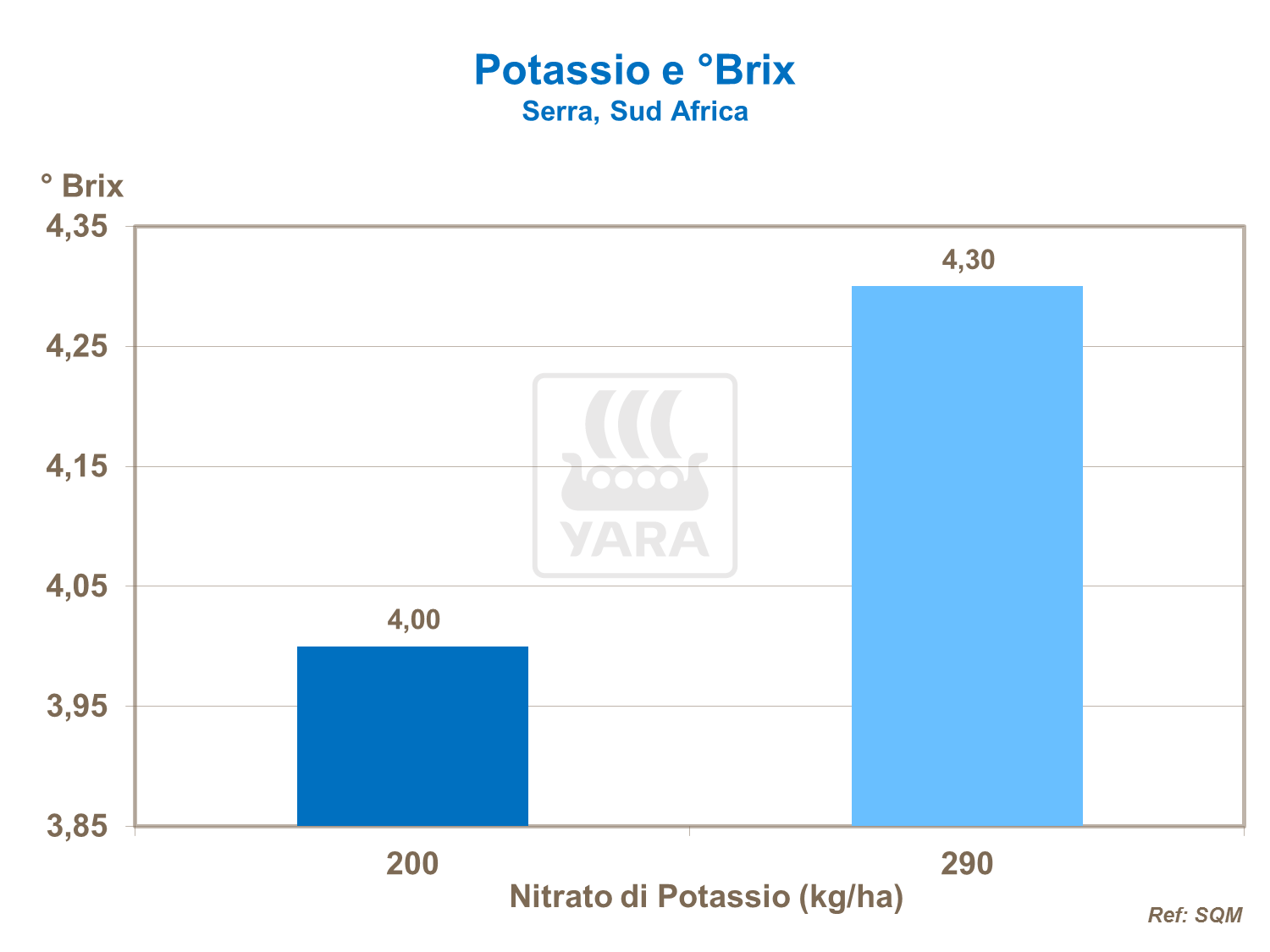 Il Potassio aumenta il contenuto di TSS nei pomodori, in quanto influisce sulla traslocazione dei nutrienti prodotti dagli organi vegetali alle bacche. Oltre a migliorare la qualità dei prodotti trasformati, questo presenta dei vantaggi in termini di miglioramentocaratteristiche organolettiche e di conservazione dei pomodori freschi.