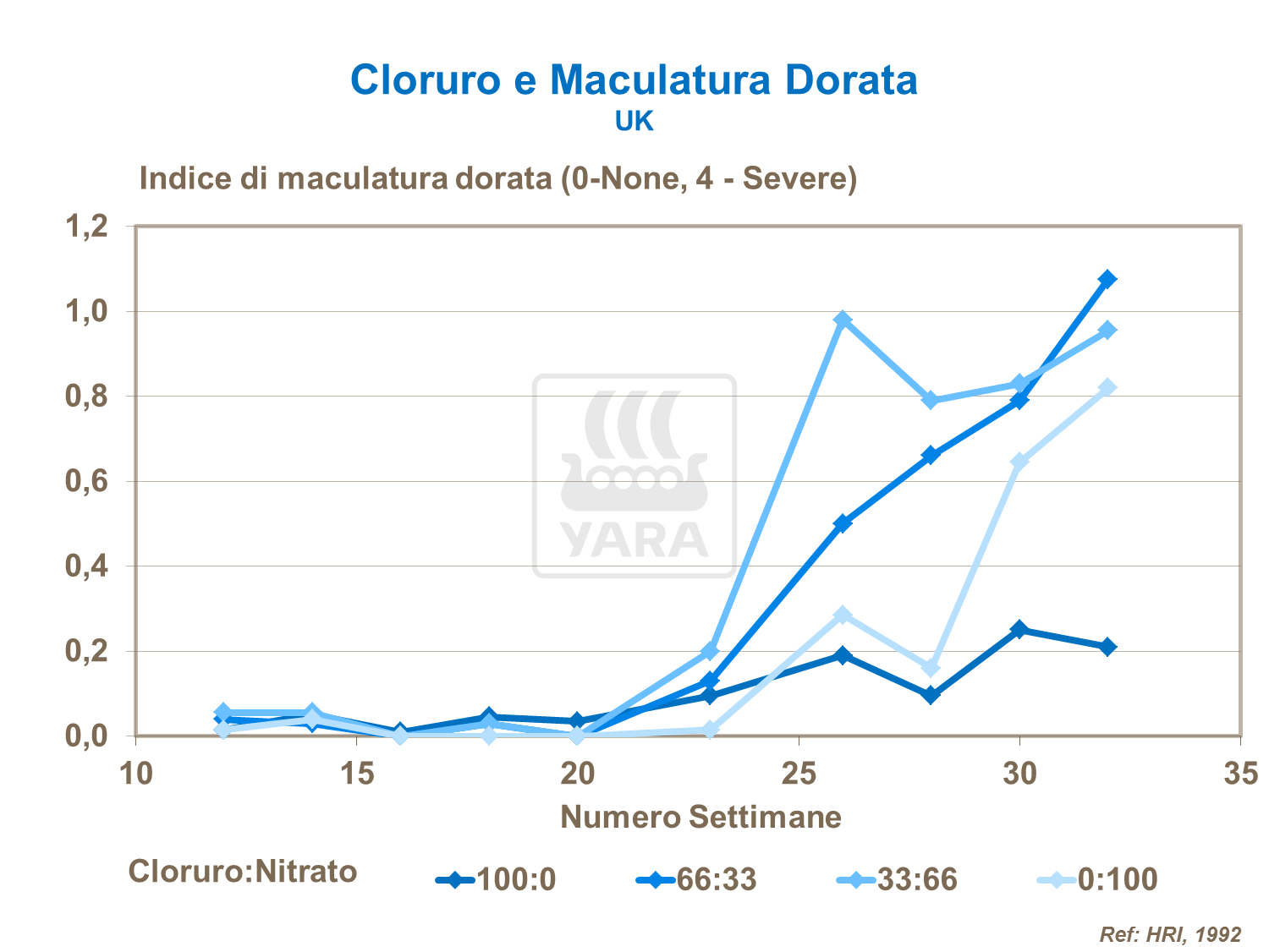 Garantire un programma nutrizionale equilibrato, soprattutto con potassio e calcio, riduce al minimo l'insorgenza di questo disturbo. L'uso di nitrati al posto di fertilizzanti a base di cloruro riduce il rischio di insorgenza delle macchie gialle.