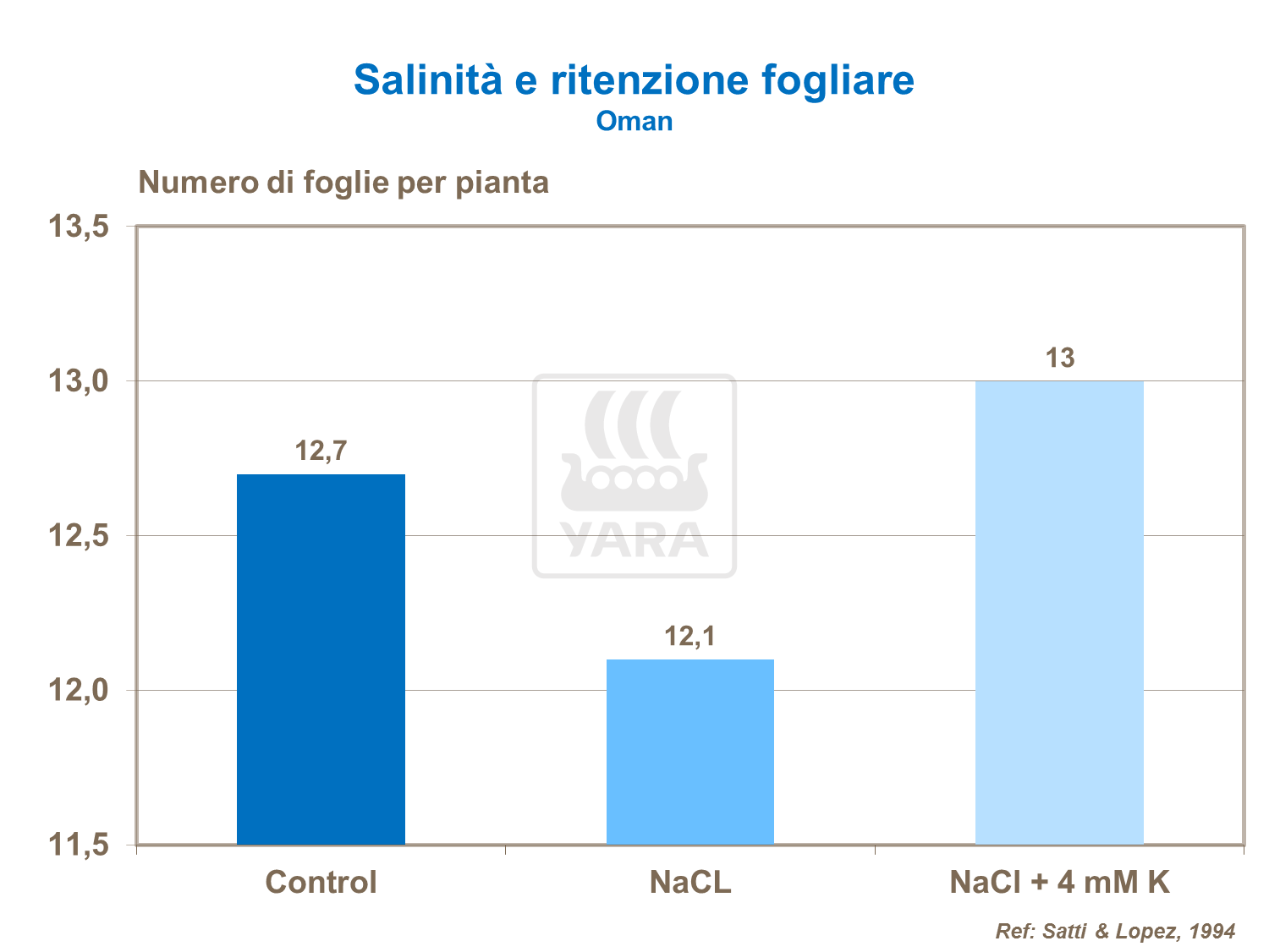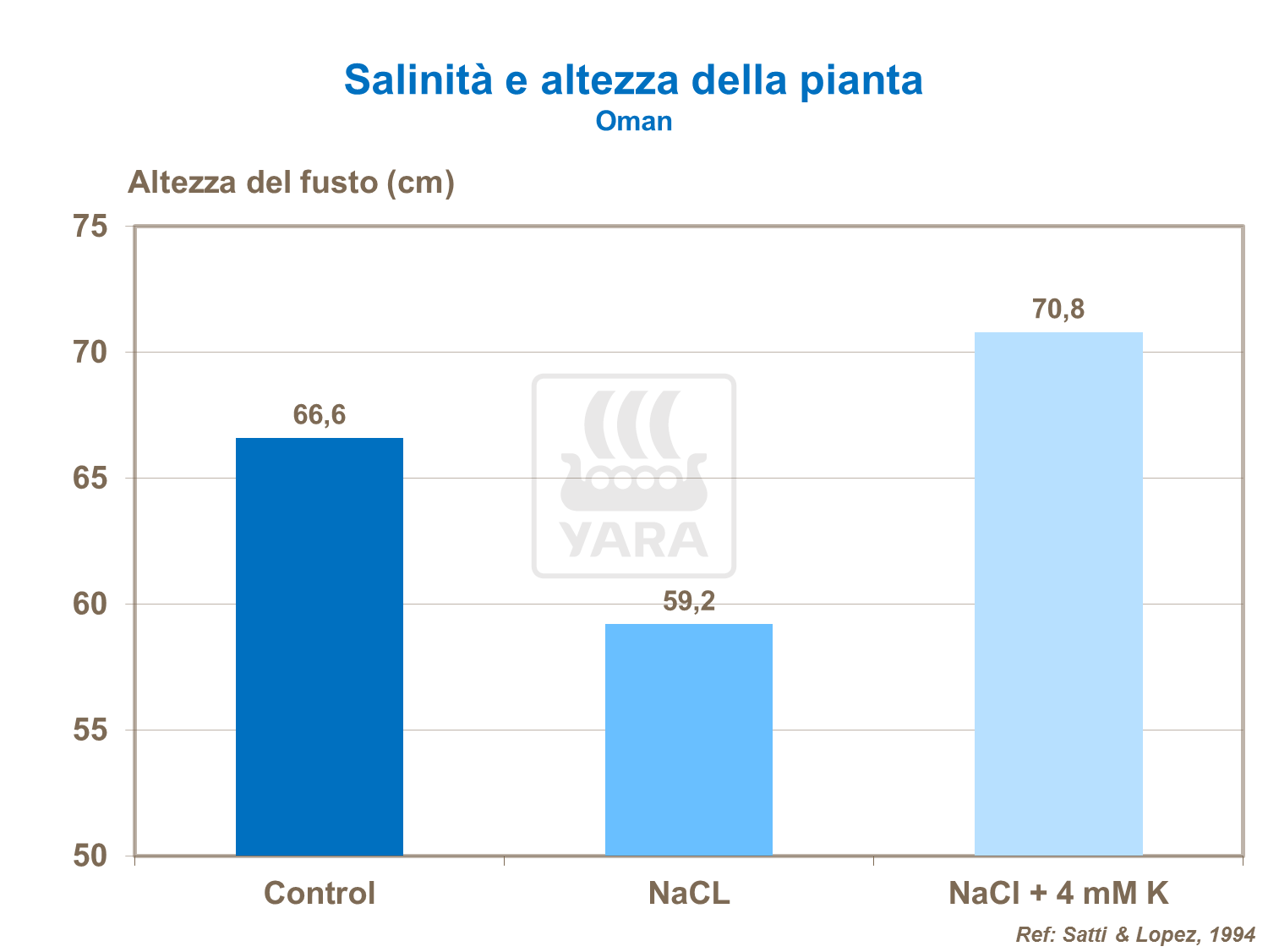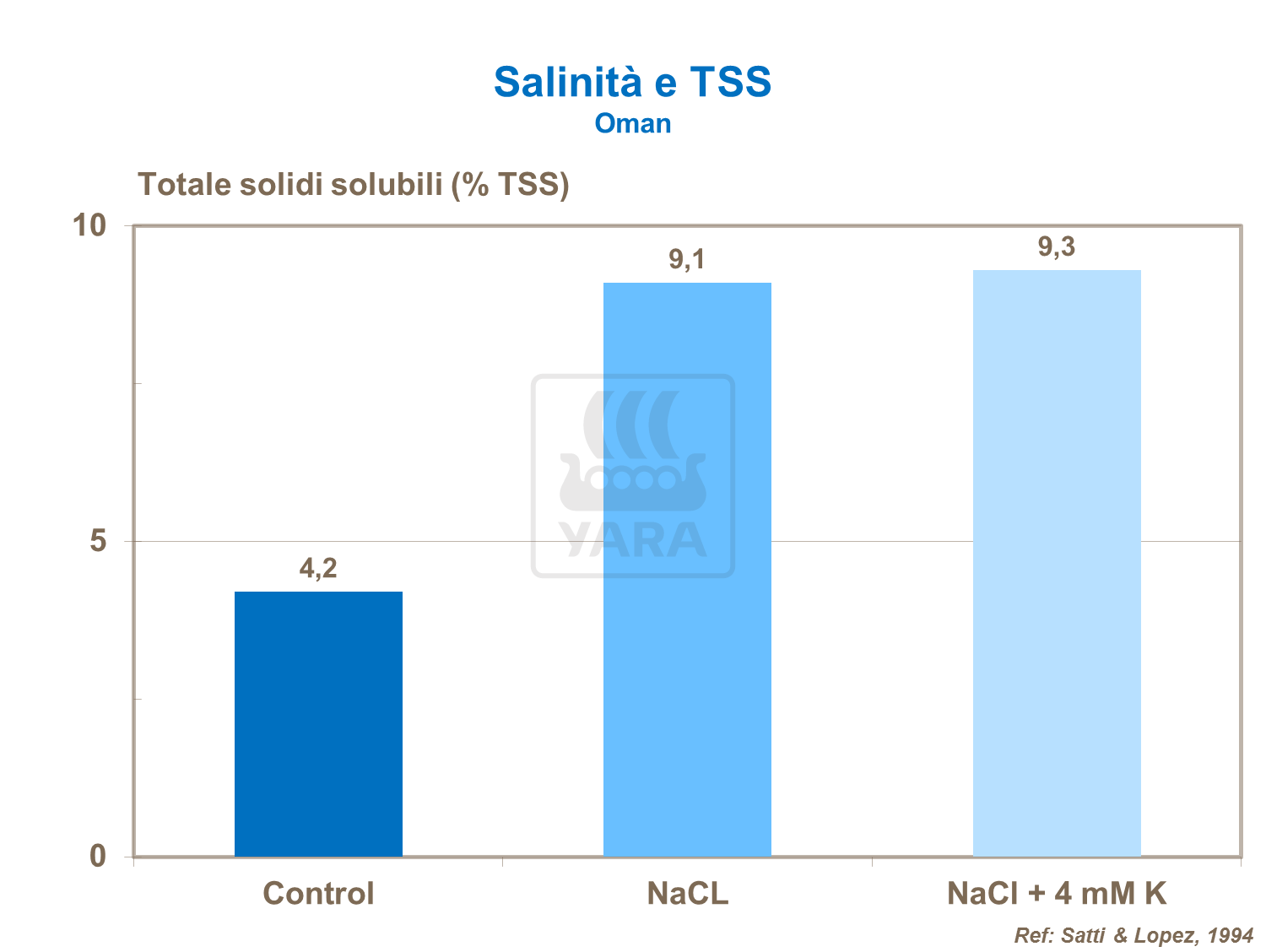 - Riduce la dimensione dei frutti (cfr. grafico sulla salinità e la grandezza dei frutti). L'aggiunta di potassio risolve questo problema.